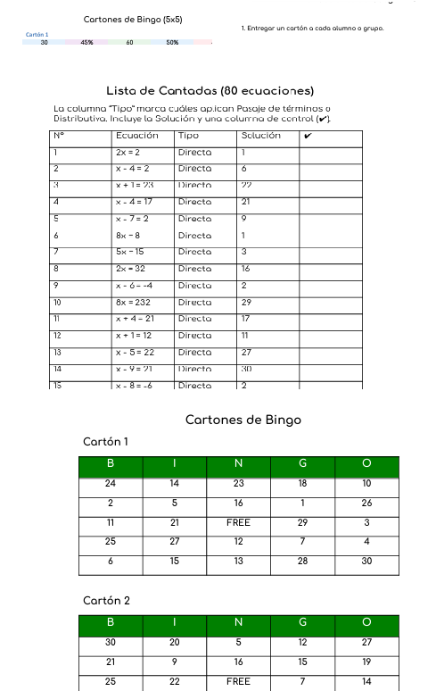 Un recurso lúdico y práctico para ejercitar la resolución de ecuaciones lineales con una incógnita. A través del clásico juego de bingo, los estudiantes resuelven ecuaciones y marcan en su cartón el resultado correcto, compitiendo de manera entretenida.