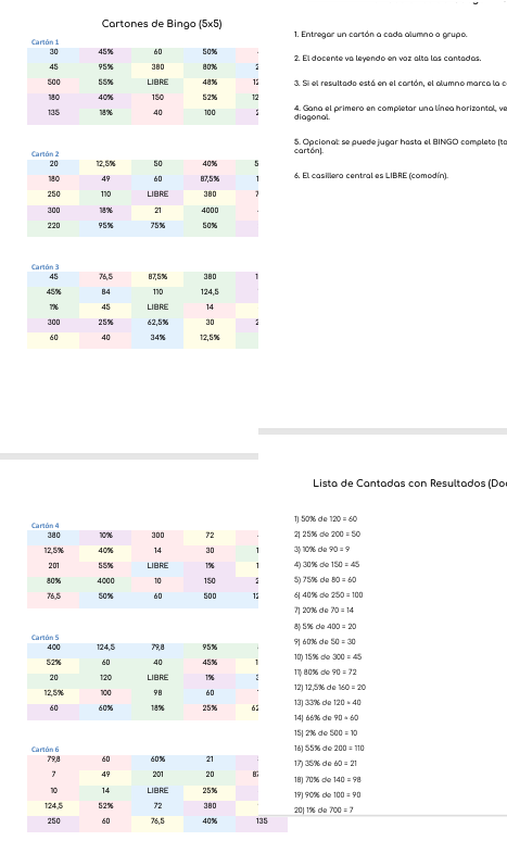 Un recurso lúdico para practicar el cálculo de porcentajes, descuentos, aumentos y equivalencias con fracciones. A través del clásico formato de bingo, los estudiantes ejercitan operaciones matemáticas mientras compiten de manera divertida.