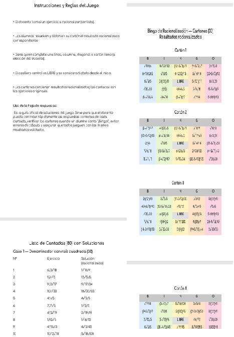 Un recurso lúdico para practicar la racionalización de denominadores de manera dinámica y divertida. A través de un clásico juego de bingo, los estudiantes resuelven ejercicios y marcan en sus cartones el resultado racionalizado correcto.