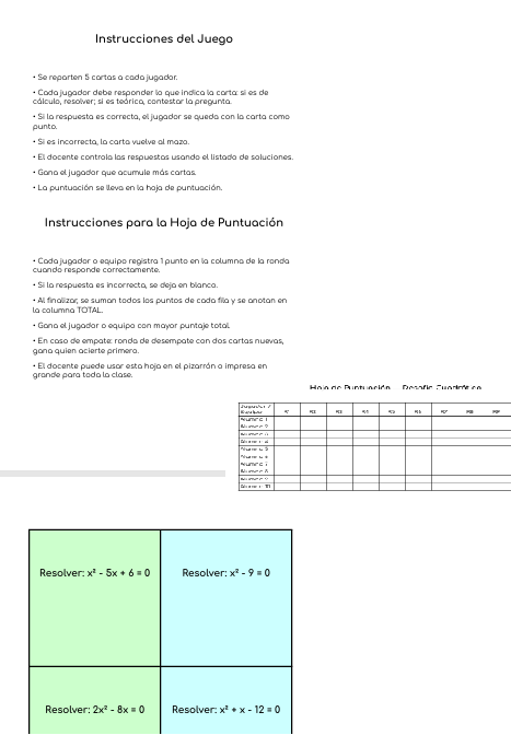 Un recurso dinámico y divertido para trabajar con funciones cuadráticas en el aula. A través de un mazo de cartas con ejercicios de resolución y preguntas teóricas, los estudiantes refuerzan conceptos clave como raíces, vértice, ordenada al origen, eje de simetría y discriminante.
